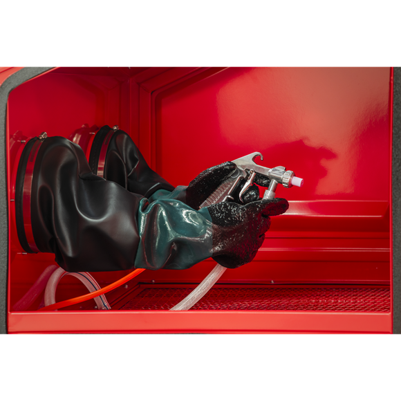 With a durable steel construction and fully sealed design, the cabinet provides efficient abrasive blasting while keeping dust contained. The large viewing window and built-in lighting ensure excellent visibility, while heavy-duty gauntlet gloves allow safe and controlled operation.